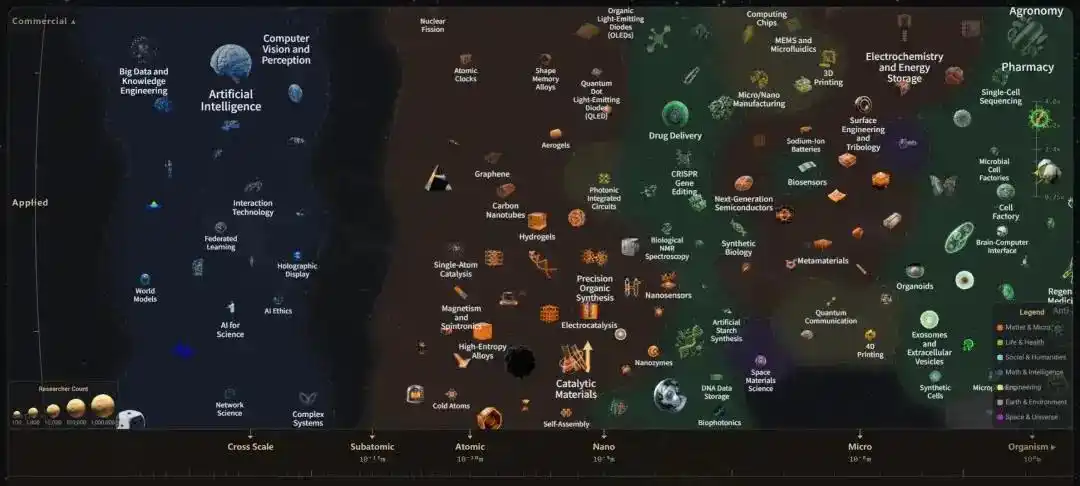 横轴,代表人类研究对象的尺度。从左到右依次是亚原子、原子、纳米,一直到生物、地球、宇宙。纯数学、AI 这样的领域,本身是为不同尺度问题提供方法和工具,则被放在了最左侧的「Cross Scale」区域。