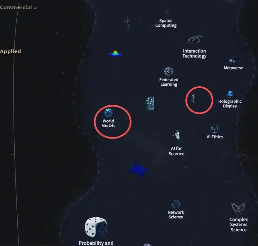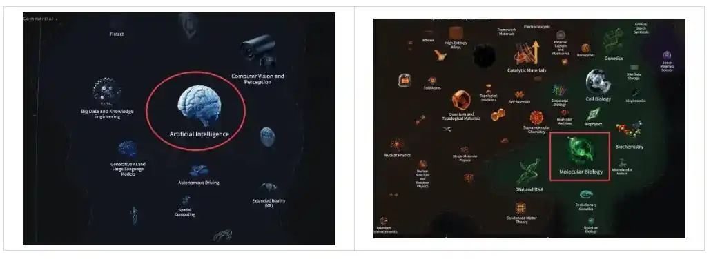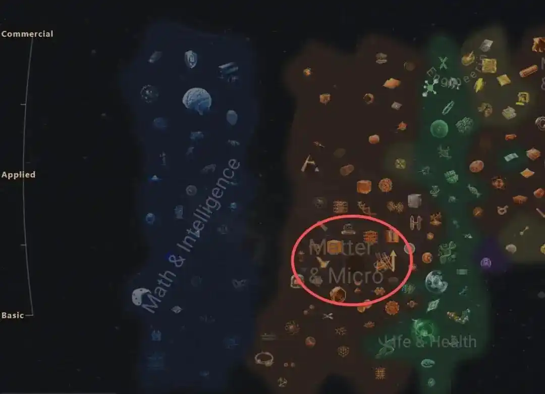 当某个区域里密密麻麻挤着大量小图标,通常意味着这个领域已经被拆出了很多细分方向。比如生命科学,里面会密集分布基因、蛋白质、细胞调控等不同子方向。这类领域通常已经非常成熟。