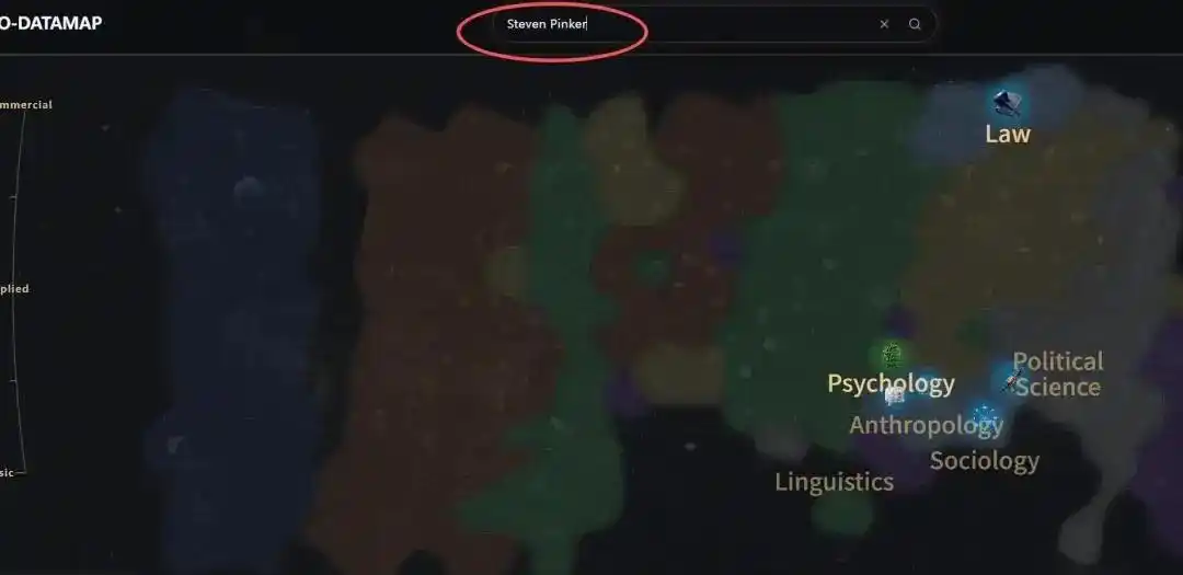 而哈佛大学心理学教授 Steven Pinker 点亮的区域更为分散,横跨心理学、语言学与认知科学等领域。不同区域的亮度虽有差异(影响力不同),却足以映射出他作为跨学科知识分子的研究广度。