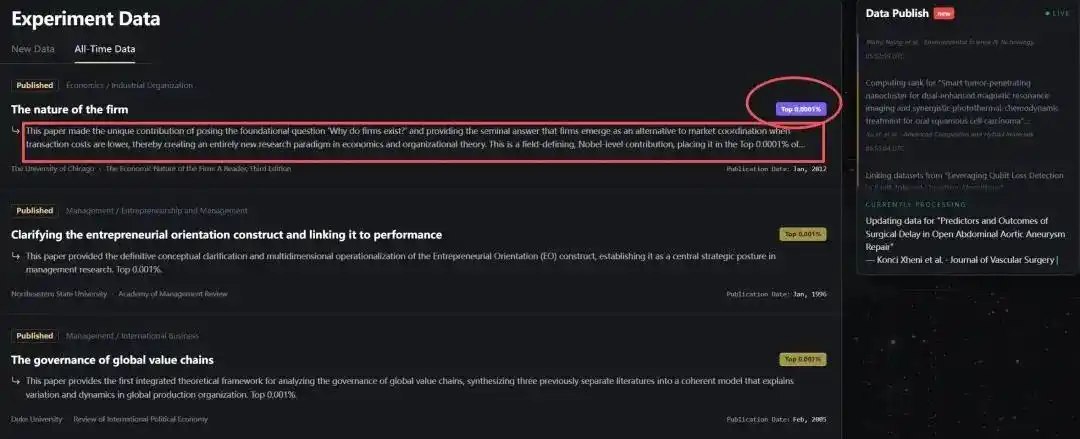 在 O-DataMap 中,返回的不是枯燥的文献列表,而是一条高度结构化的科研事件流(Experiment Data)。一个极罕见的紫色标签会瞬间击中你:Top 0.0001%。