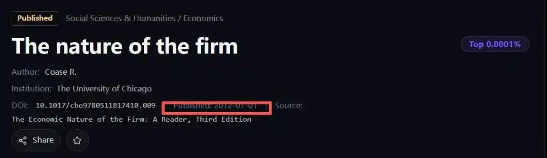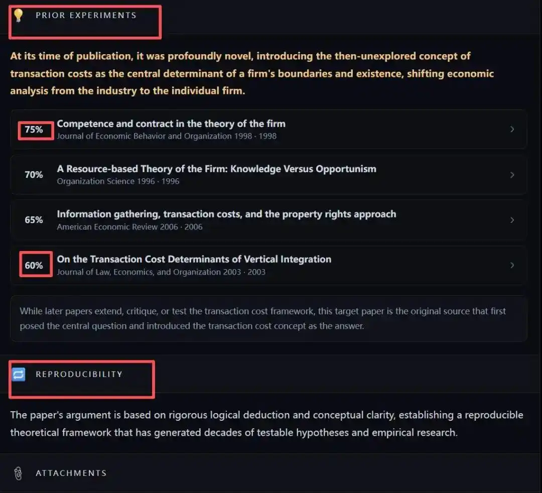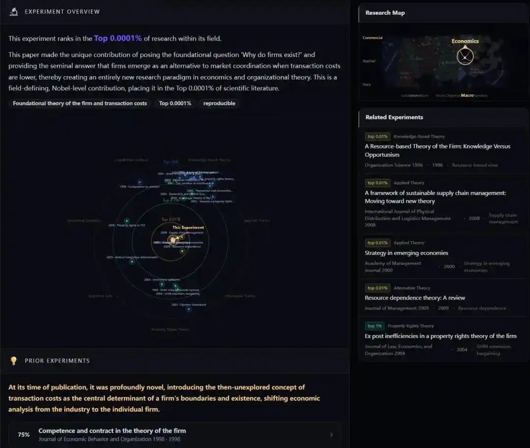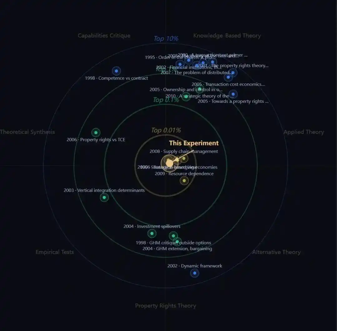比如,系统会识别出《企业理论中的能力与合同》与科斯框架有很高的相关度,属于典型的「嫡系演化」;而像《纵向一体化的交易成本决定因素》这类更偏具体商业行为分析的研究,相似度则会低一些。