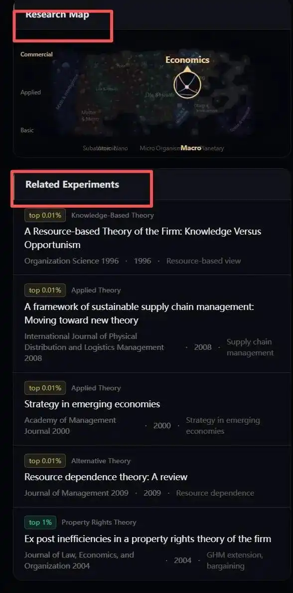 系统用同心圆结构,把这篇论文放在中心位置, 最核心的一圈,是它作为奠基性理论的角色;外围一圈圈分布的,则是后来受它影响的重要研究。比如,垂直整合、资源依赖、供应链管理等方向,都能看到清晰的延展轨迹。