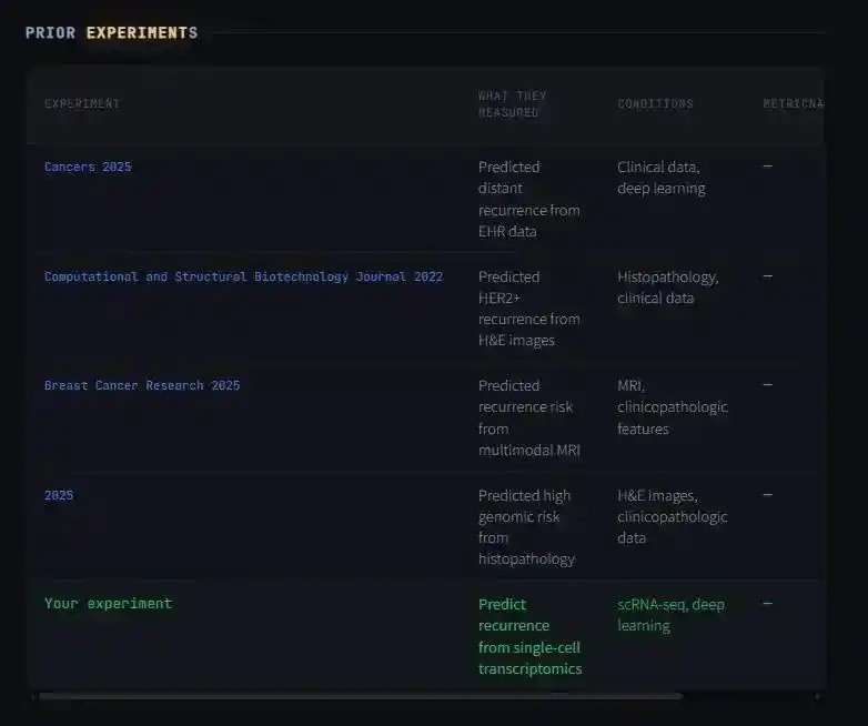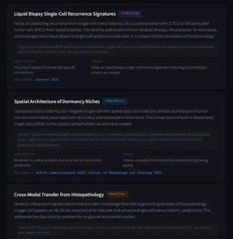 但 AI 进一步通过检索发现,在「单细胞+乳腺癌+复发随访」这个交叉点上,全球仅有 17 篇相关论文。
